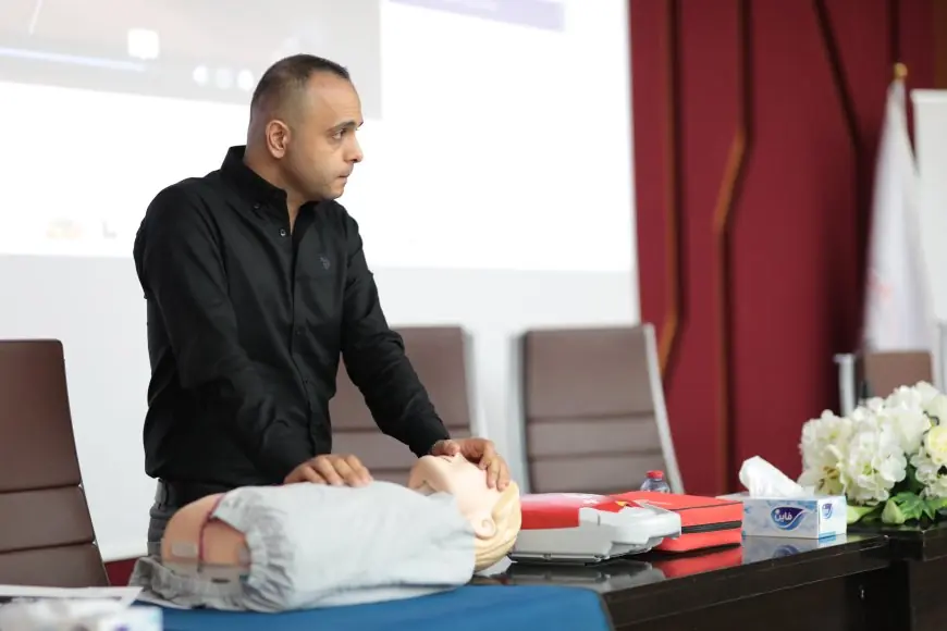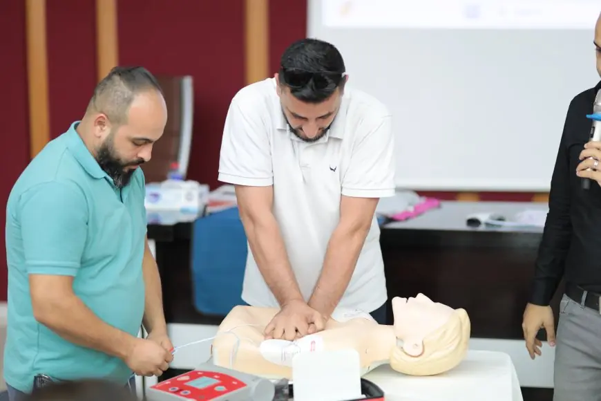 سبق ذلك عقد دورة تدريبية متخصصة استهدفت عددا من موظفي الجامعة حول آلية استخدام جهاز الـAED وآلية لتعامل مع الحالات الحرجة، قدّمها الدكتور أحمد حدرب – مدير مركز القلب والمدرّب المعتمد من جمعية القلب الأمريكية (AHA).