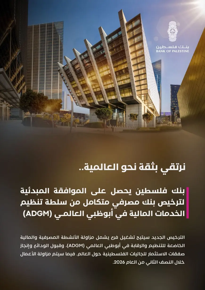 أبوظبي- كانون أول/ ديسمبر 2025: أعلن بنك فلسطين عن نيله الموافقة المبدئية من سلطة تنظيم الخدمات المالية في أبوظبي العالمي (ADGM) المركز المالي الدولي للعاصمة الإمارتية ، أبوظبي للحصول على ترخيص الفئة الأولى (Category 1 – CAT1)، مما يتيح له تشغيل فرع مصرفي متكامل الخدمات بما يشمل مزاولة الأنشطة المصرفية والمالية الخاضعة للتنظيم والرقابة في أبوظبي العالمي (ADGM)، وعلى وجه الخصوص قبول الودائع وإنجاز صفقات الاستثمار، مستهدفاً مجتمع الجاليات الفلسطينية في جميع أنحاء العالم.