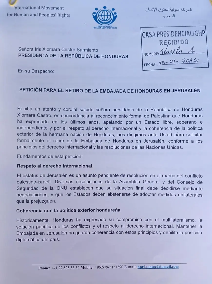 كما شدّدَت الرسالة على أن استمرار وجود سفارة هندوراس في القدس يتعارض مع السياسة الخارجية المعلنة للدولة، القائمة على احترام القانون الدولي، والتعددية، والحل السلمي للنزاعات. ووفقاً للمنظمات، فإن هذا الوضع ينعكس سلباً على المكانة الدبلوماسية لهندوراس وصورتها الدولية، لا سيما في علاقاتها مع دول أمريكا اللاتينية والعالم العربي والمنظمات متعددة الأطراف.